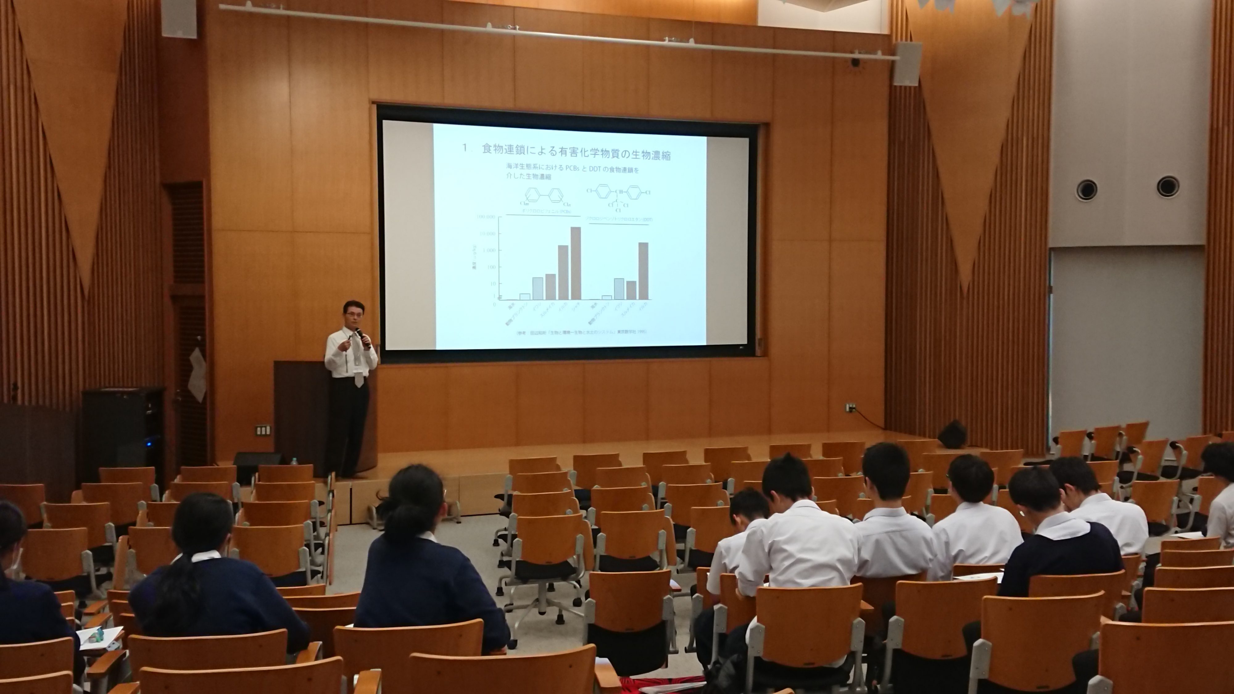 講師は、大阪薬科大学 佐久間覚准教授(環境分子生理学研究室)で、テーマは「有害化学物質から生(命)を衛(まもる)には?」でした。