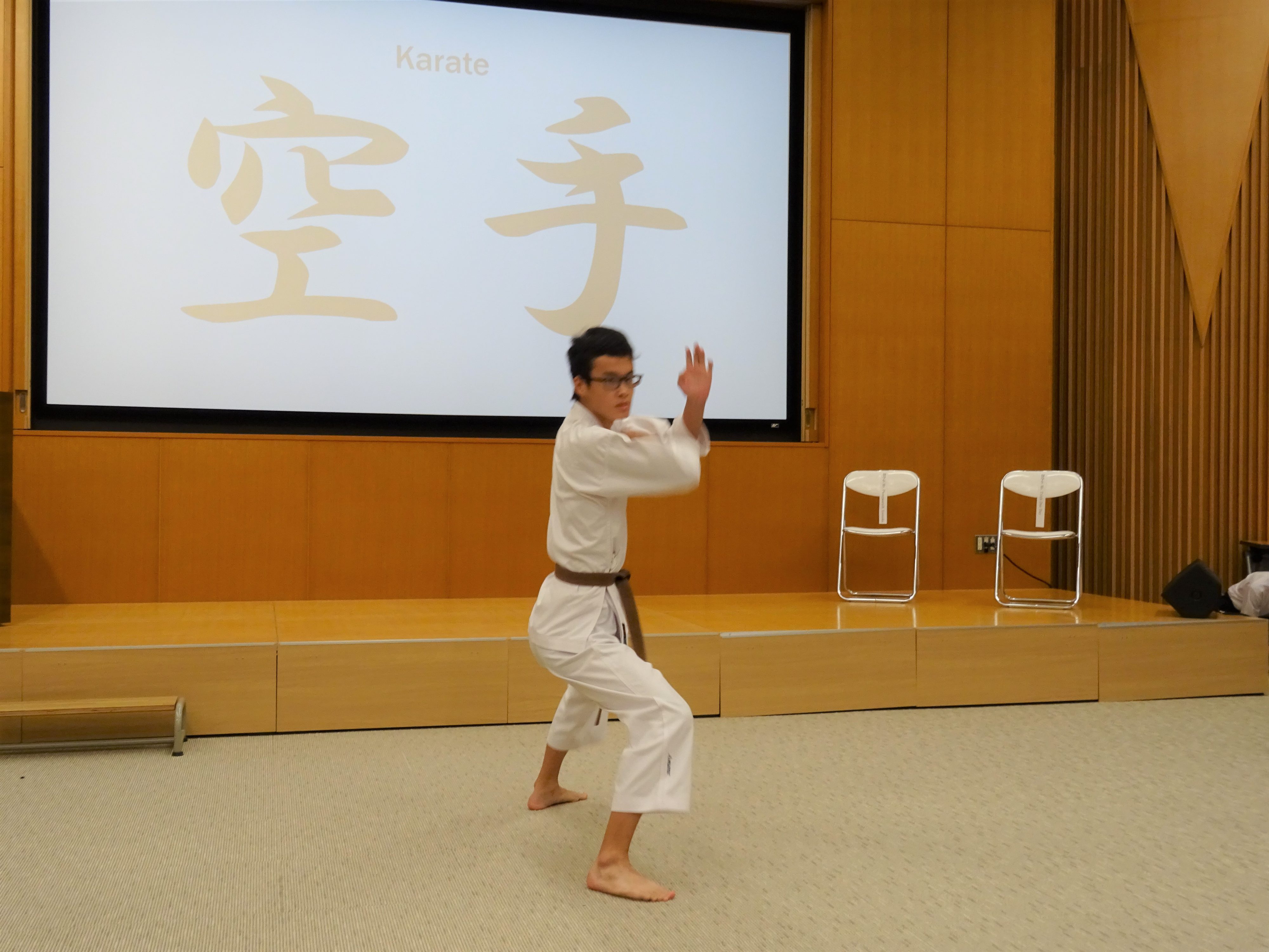 翌27日(火)には、留学生が所属する高校1年生全員がコナコピアホールに集合し、歓迎会を開催しました。最初に、開会にあたって司会者から前説があり、留学生入場後、学校長より留学生受け入れに至った経緯や留学生の紹介をしていただきました。学年の代表生徒より歓迎の言葉を贈り、留学生からもそれぞれ自己紹介をしてもらいました。留学生それぞれへの質疑応答のあとに、最後はパフォーマンスで楽しんでもらおうと、漫才2組、日本の文化の一つである空手についてその説明と型の演武をそれぞれ生徒1名が行いました。そして素晴らしいパガニーニのバイオリン・ソロ演奏に耳を傾け、滞在中の学校行事の紹介を行いました。最後に高1学年団の先生の紹介を行い、楽しく温かい雰囲気の中で歓迎会を終わることができました。