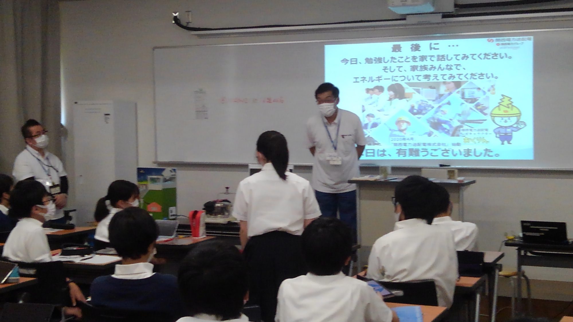 「SDGsとゼロカーボン」という世界的で最先端のテーマのもと、関西電力グループが取り組み、あるいは関わっている実例を紹介しました。さらに発電の仕組みについて、モデルを使った実演によって理解を深めました。