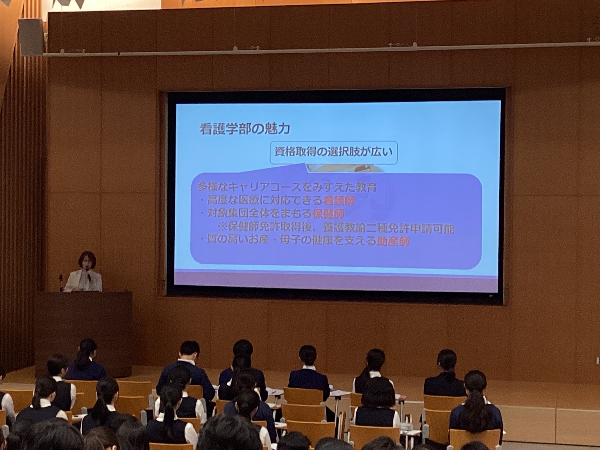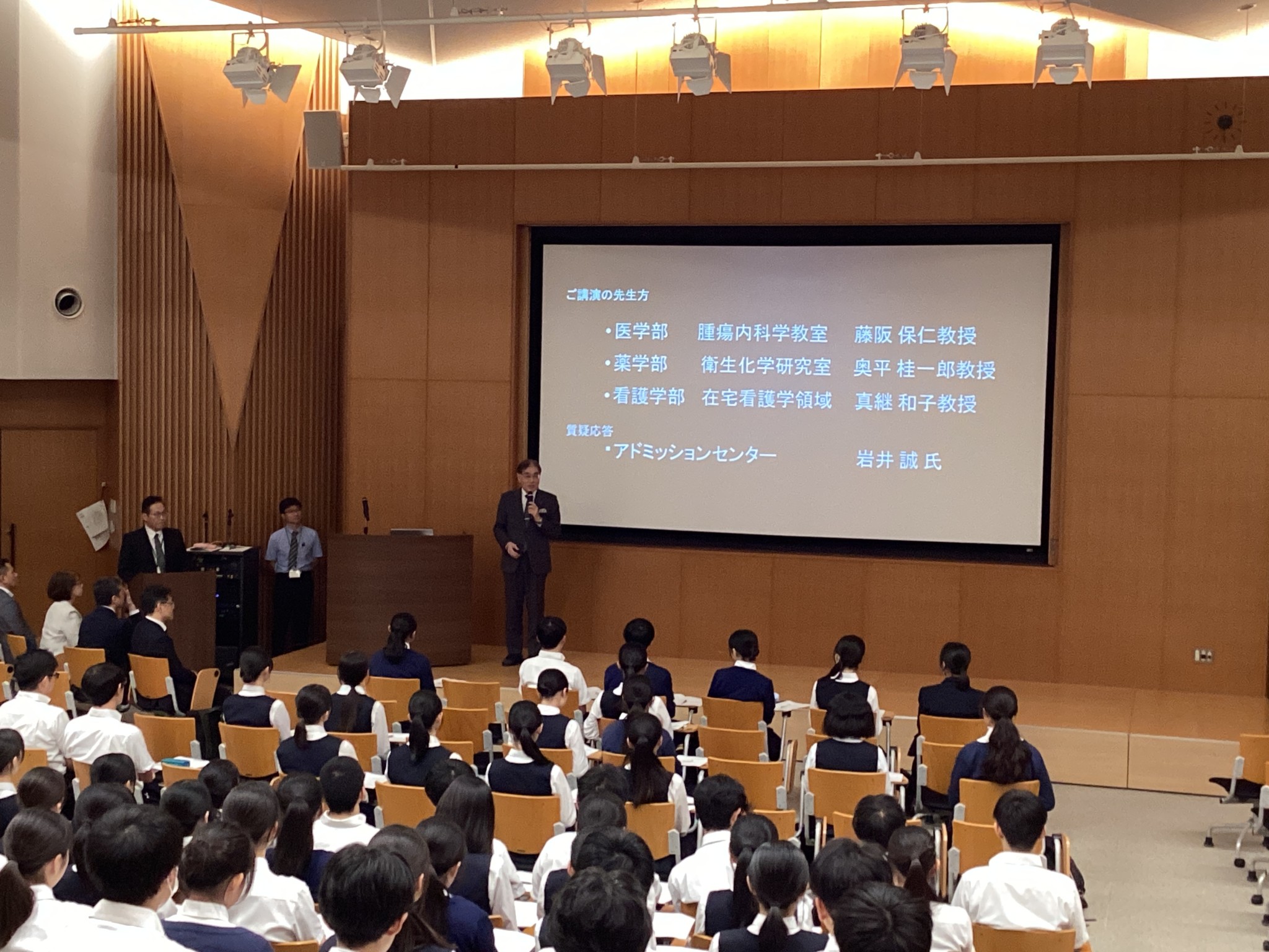 説明会では、医学部・薬学部・看護学部それぞれの特色や研究内容についてご講演いただき、3学部が連携して医療を支えていることを具体的に学ぶことができました。生徒たちは熱心にメモを取りながら耳を傾け、医療の現場に対する理解を深めていました。特に医学部の藤坂先生が「親切な医者であることを心がけている」というお言葉が印象的で、生徒たちに強い共感と憧れを与えました。また、事前に募集した質問には多数の応募があり、生徒たちの医療分野への関心の高まりがうかがえました。