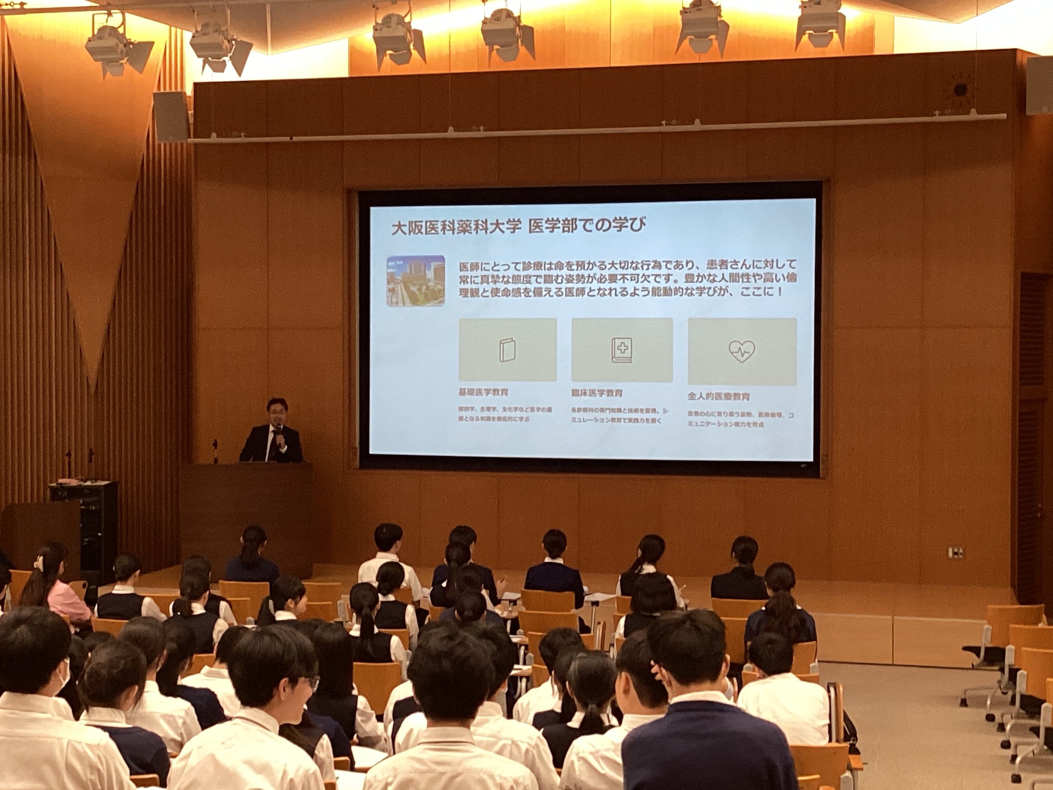 人と向き合う姿勢や思いやりの心は、医療関係者に限らず、どの職業にも通じるものであると教員も改めて認識する機会となりました。今回の説明会は、生徒たちにとって進路を考える上で大きな糧となり、大阪医科薬科大学の温かな雰囲気にも触れる貴重な時間となりました。