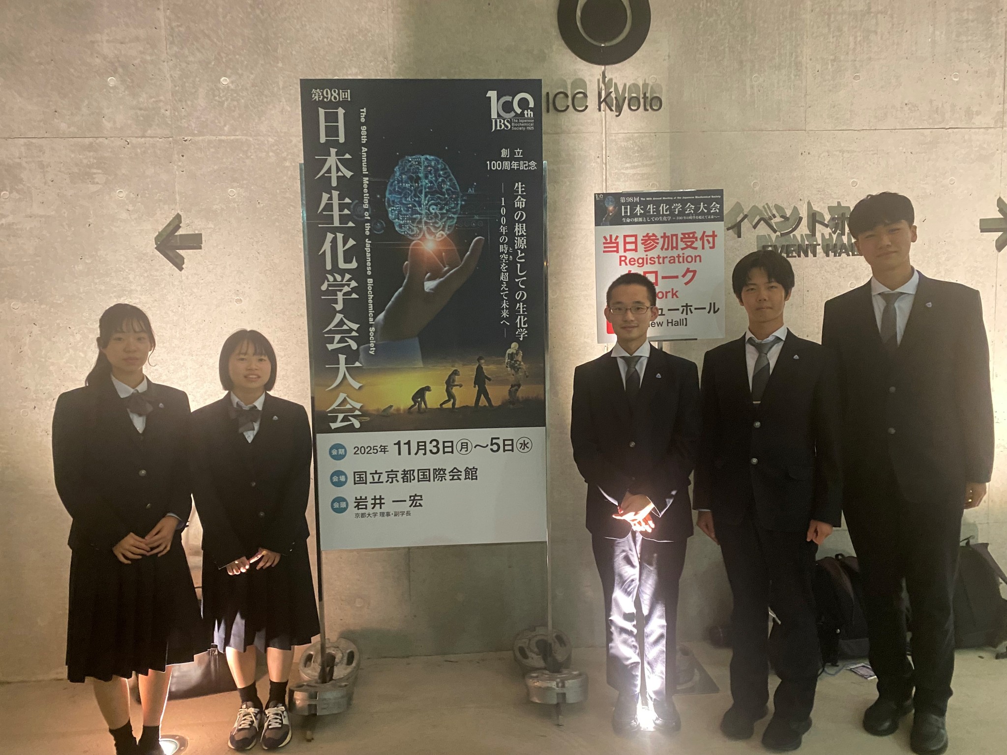 11月3日から5日にかけて、国立京都国際会館にて日本生化学会が開催されました。3日に行われた高校生研究発表セッションに本校高校2年生2班が参加し、これまで取り組んできた課題研究の成果をポスター形式で発表しました。発表テーマは、アレロパシーやタニシに関する内容で、いずれの班も日頃の探究活動の成果を堂々と披露しました。特にアレロパシーの研究について発表した班は、その内容と発表の質が高く評価され、見事「銀賞」を受賞しました。