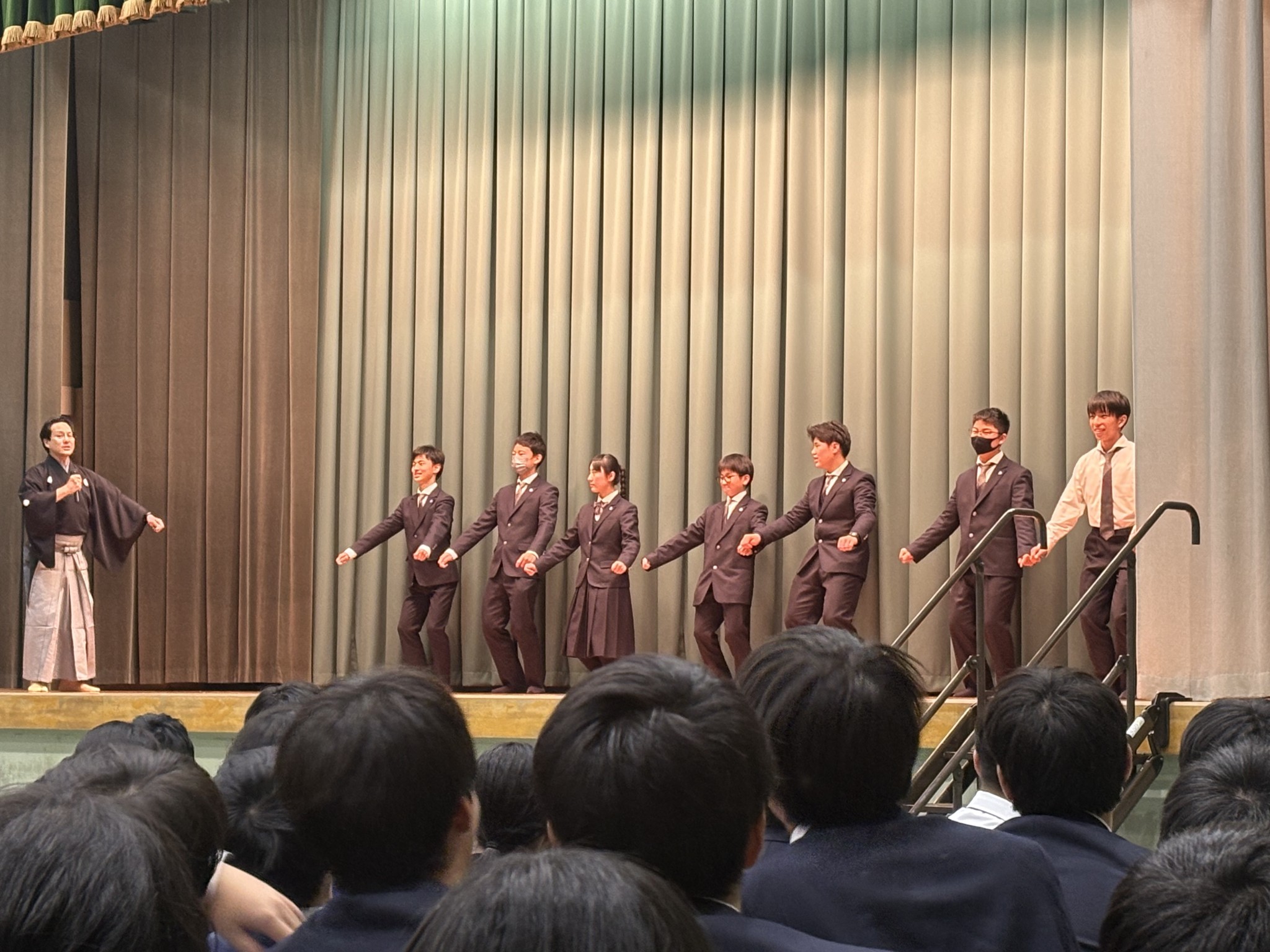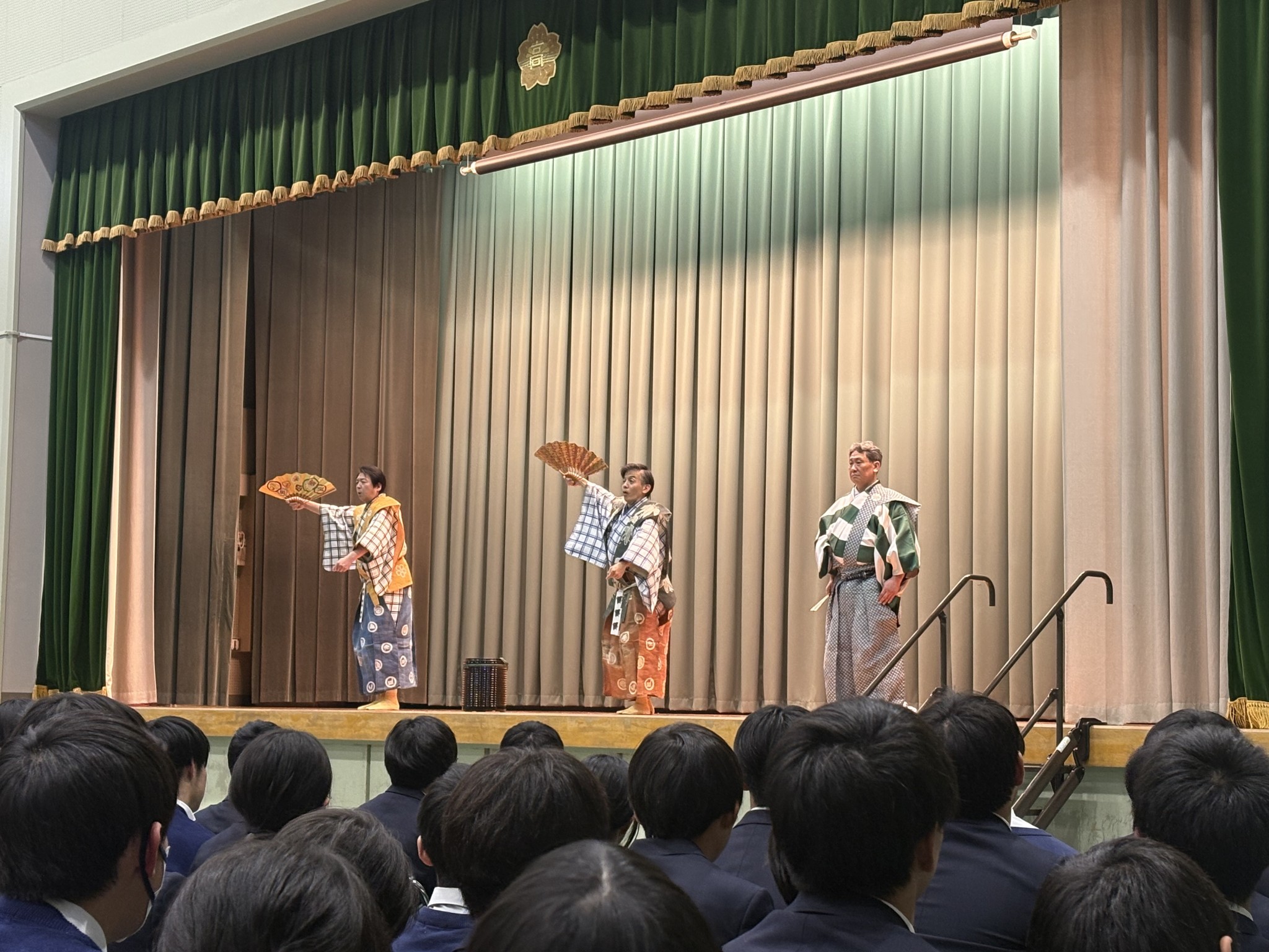 11月21日(金)の午後、本校体育館にて中学・芸術鑑賞会が行われました。今年度は古典芸能を鑑賞する年で、大蔵流の狂言「柿山伏」「附子」の二番を鑑賞しました。生徒参加型のワークショップもあり、古典を身近に感じる大変よい機会となりました。このような行事を通じて日本の伝統芸術に対する理解を深め、文化的教養を養ってほしいと思います。