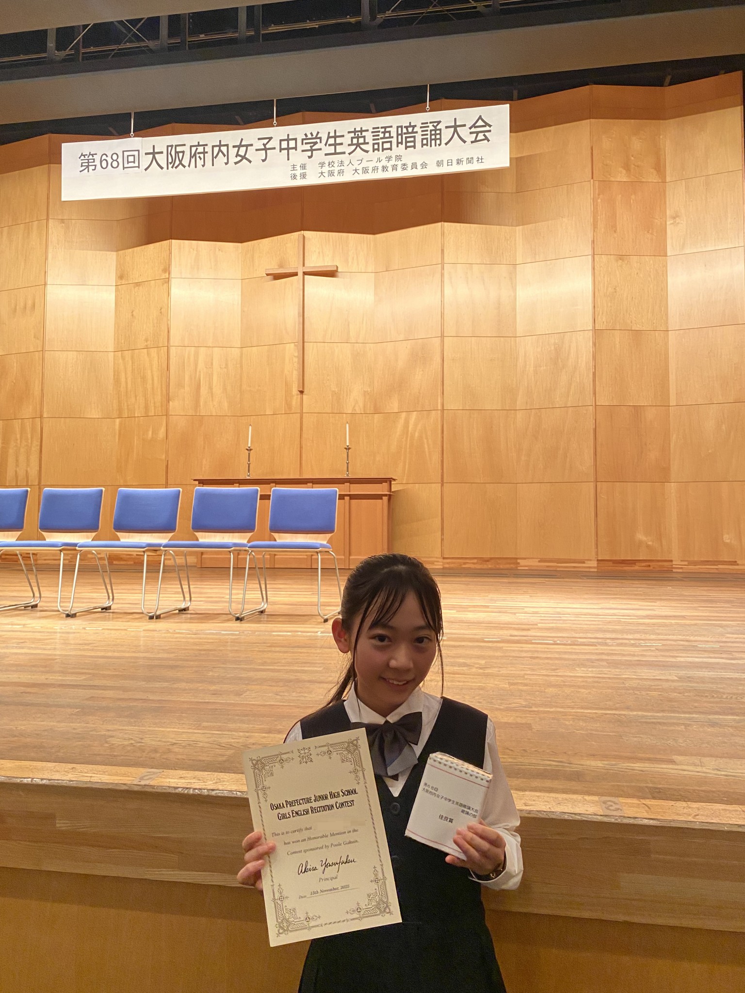 11月15日(土)、プール学院中学校・高等学校にて開催された「第68回大阪府内女子中学生英語暗誦大会」において本校中学1年生が佳良賞を受賞しました。