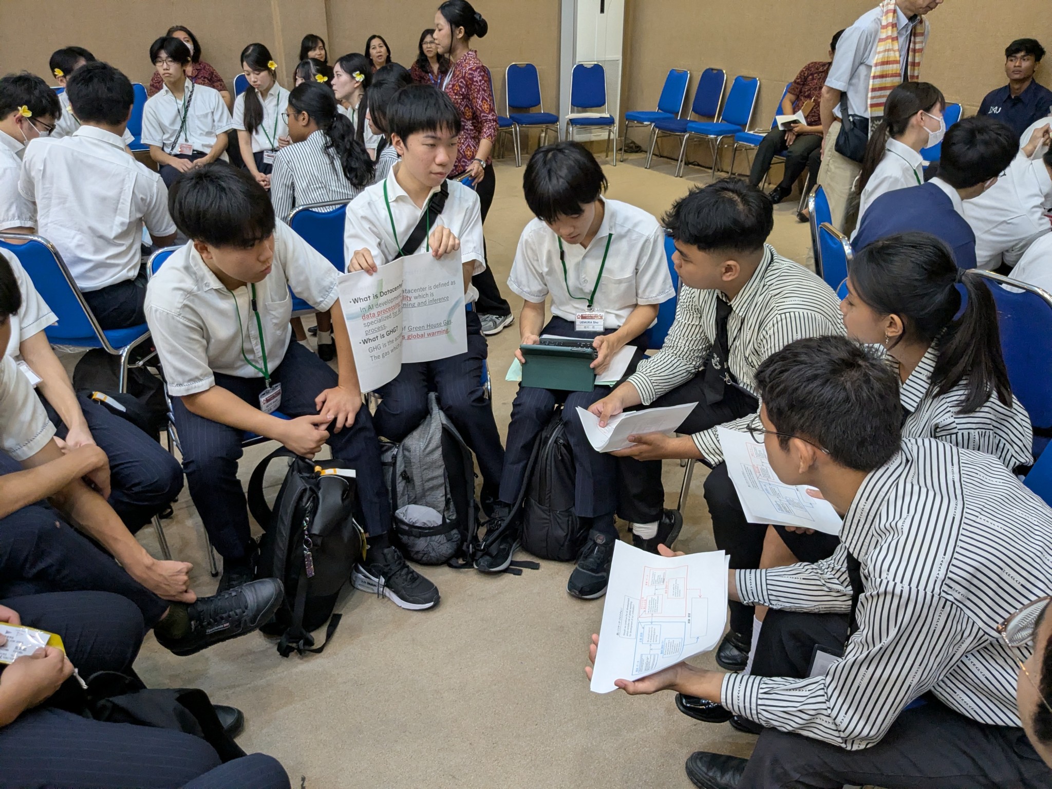午前中は、公立のデンパサール第7高校を訪問し、同校生徒による伝統的な踊りの披露、両校校長の挨拶、両校の学校紹介動画の視聴などの歓迎セレモニーが行われました。その後、本校生徒による英語による挨拶、「対話型論証モデル」の英語による説明を行った上で、7つのグループに分かれて「科学倫理」を主題とし、各自・各班が設定した課題について英語でプレゼンテーションを行いました。挨拶や説明、発表ともに、基本的に前日とは異なる個人・班が発表し、GLコース生全員が英語による発表を行いました。中には前日に引き続いて挨拶や発表をする生徒がいましたが、前日よりも堂々と発表する姿は、とても頼もしく思えました。