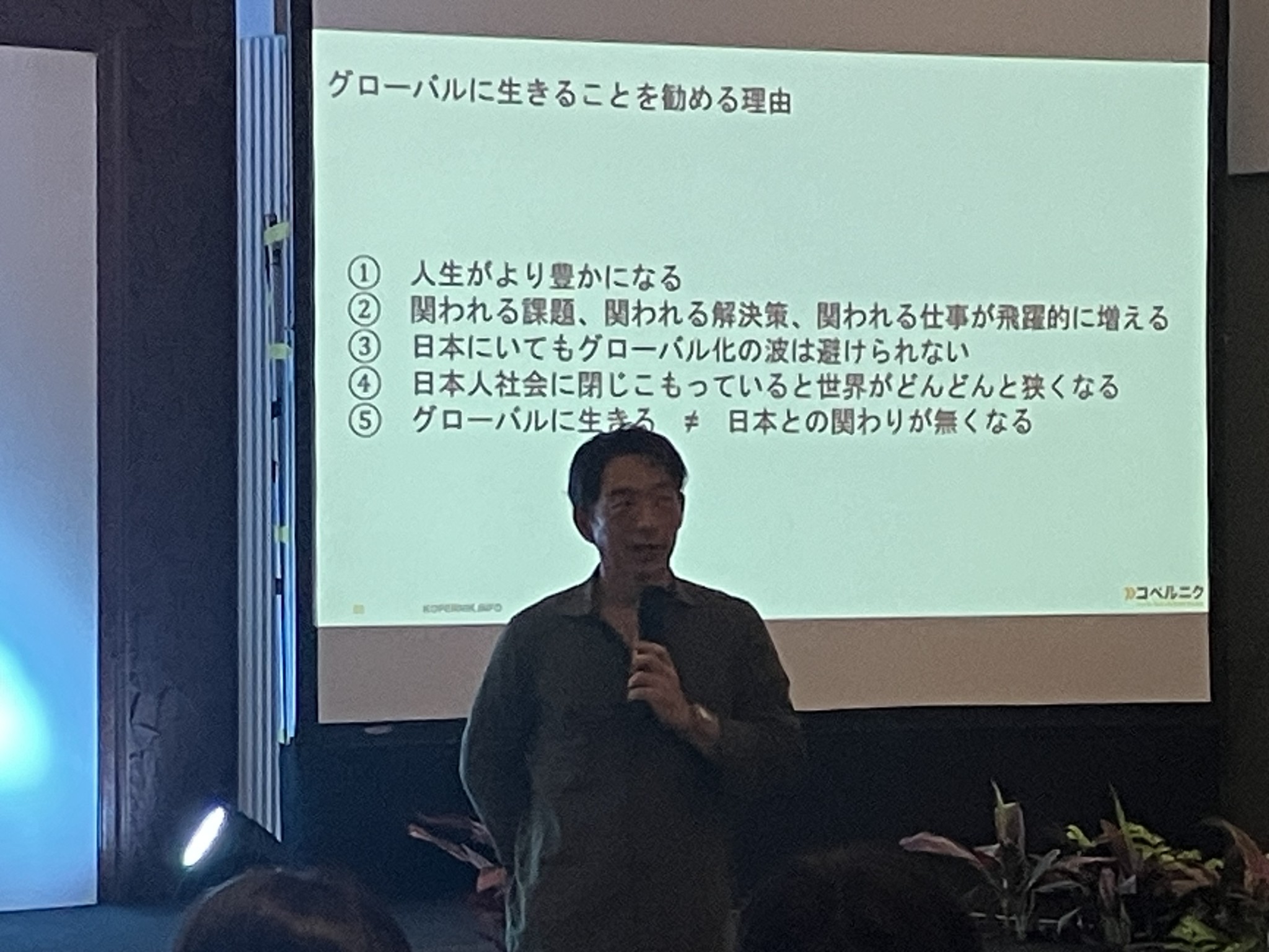 インドネシア料理を中心とした美味しい朝食を終え、ホテルのバンケットルームで研修最初のプログラムを受講しました。生徒たちは、元国際連合の職員で、開発途上国の社会問題及び環境問題の解決などに取り組むコペルニクの共同創設者・最高経営責任者、本校OBでもある中村俊裕氏による特別講義を受け、正にグローバルリーダーとして活躍している先輩から、「(多様な人と交わることで)人生が豊かになる」こと、そしてグローバルに生きるためには「好奇心を持ち、(文系理系の線引きをせずに)常に新しいことを学ぶ」ことなどが重要であるとのお話を伺いました。