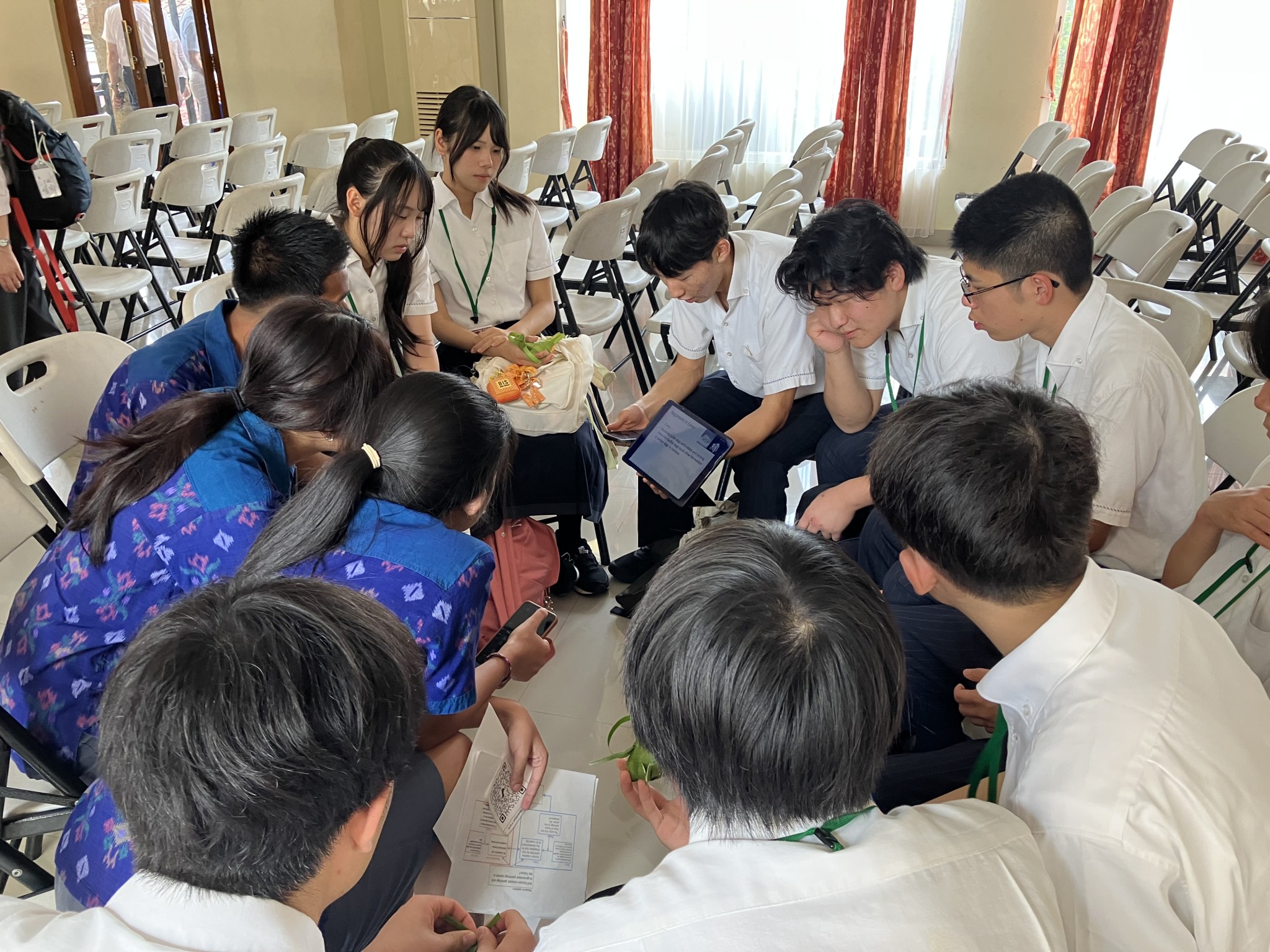 午前中は、私立のハラパンクリスチャンスクールを訪問し、両国の国家斉唱、同校の生徒たちや先生方による伝統的な踊りの披露、両校校長の挨拶、両校の学校紹介動画の視聴などの歓迎セレモニーが行われました。その後、本校生徒による英語による挨拶、「対話型論証モデル」の英語による説明を行った上で、7つのグループに分かれて高1から取り組んできた「科学倫理」を主題とし、各自・各班が設定した課題について英語でプレゼンテーションを行いました。たどたどしい英語での発表や質疑応答も見られましたが、同校の生徒たちは熱心に耳を傾けてくれ、それぞれの思いにしたがい大いに交流していました。発表の一方で、同校の生徒による学校案内をしていただき、本校とは異なる海外の学校の雰囲気を感じ取っていました。