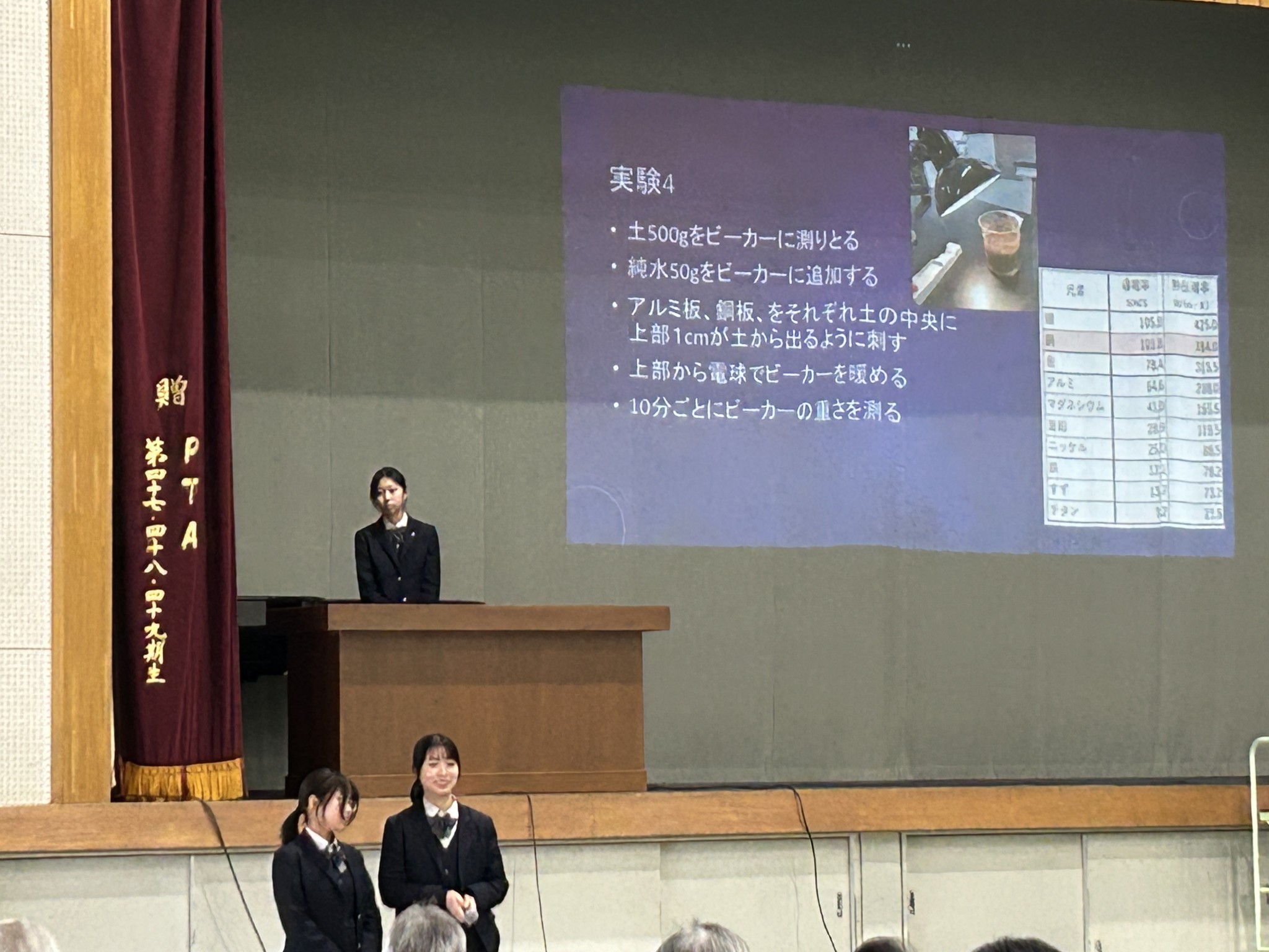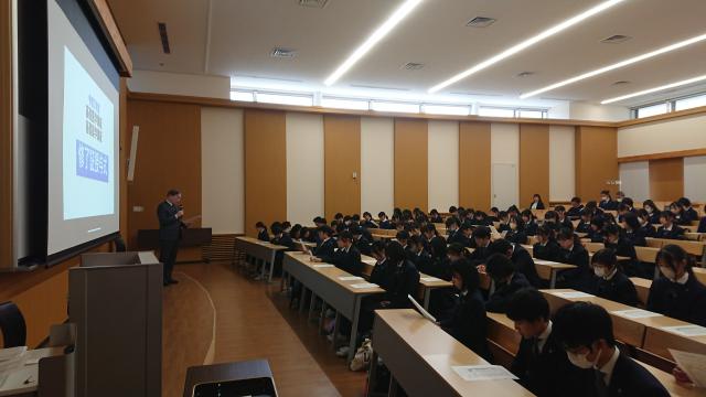 1月15日(木)、大阪府立四条畷高等学校にて課題研究発表会が開催され、本校からは理数探究化学班の2年生がゲスト校として参加し、日頃の研究成果を発表しました。今回の研究テーマは「金属製の杭の有無による土壌中の水分量への影響」です。土壌環境の変化を多角的に検証する内容であり、発表後の質疑応答では多方面から活発な質問が寄せられました。