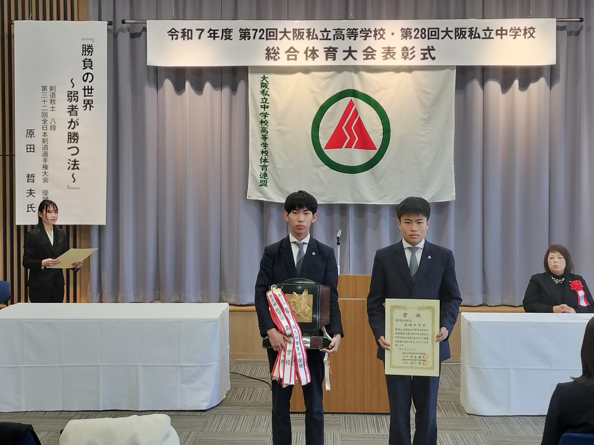 2月21日(土)、大阪私学会館にて令和7年度 第72回高等学校・第28回大阪私立中学校総合体育大会 表彰式が行われ、男子の部・女子の部ともに表彰を受けました。総合体育大会は私学大会における全競技の結果を点数化し、その総得点により学校の順位を決定するもので、本校代表として剣道部およびバドミントン部の生徒が賞状・盾・杯を受け取りました。