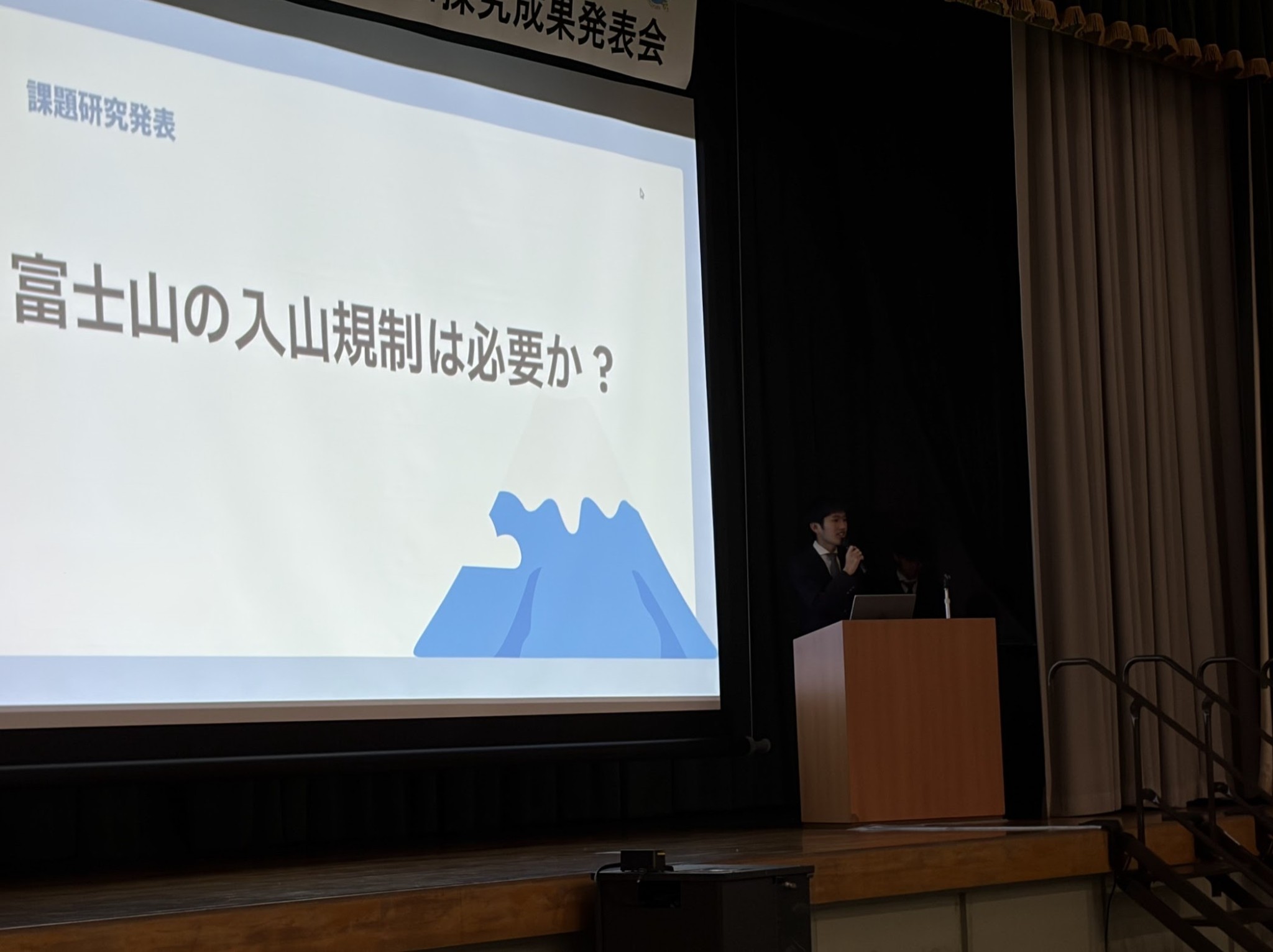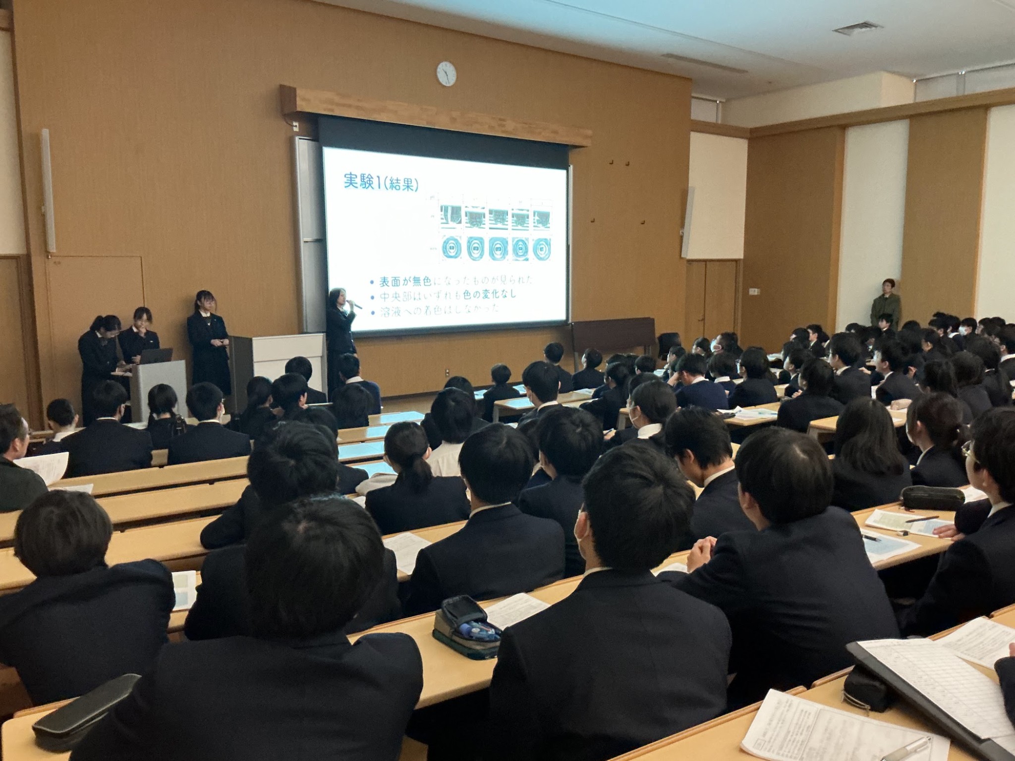 さらに今年度は、従来のポスター発表やコースごとの口頭発表に加えて、中学3年生から高校2年生まで全員が参加する「合同発表会」を新設しました。これは、各コースを代表する発表を一堂に集めたもので、これまで触れる機会の少なかった他コースの取り組みを知る場として大きな刺激となりました。多彩で質の高いプレゼンテーションは、発表者・聴衆ともに大きな学びをもたらし、本校の探究学習が育んできた内発的な学びの豊かさを強く感じさせるものでした。