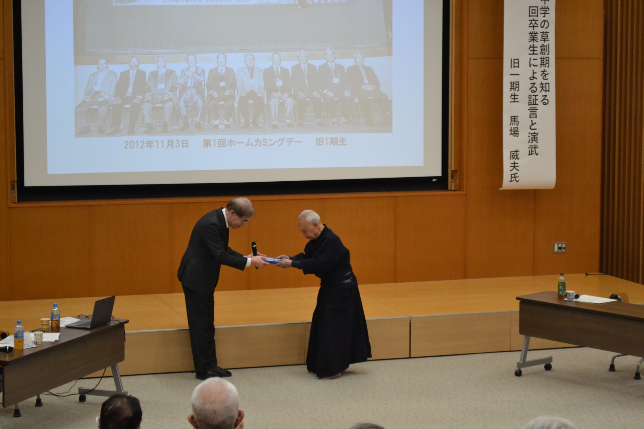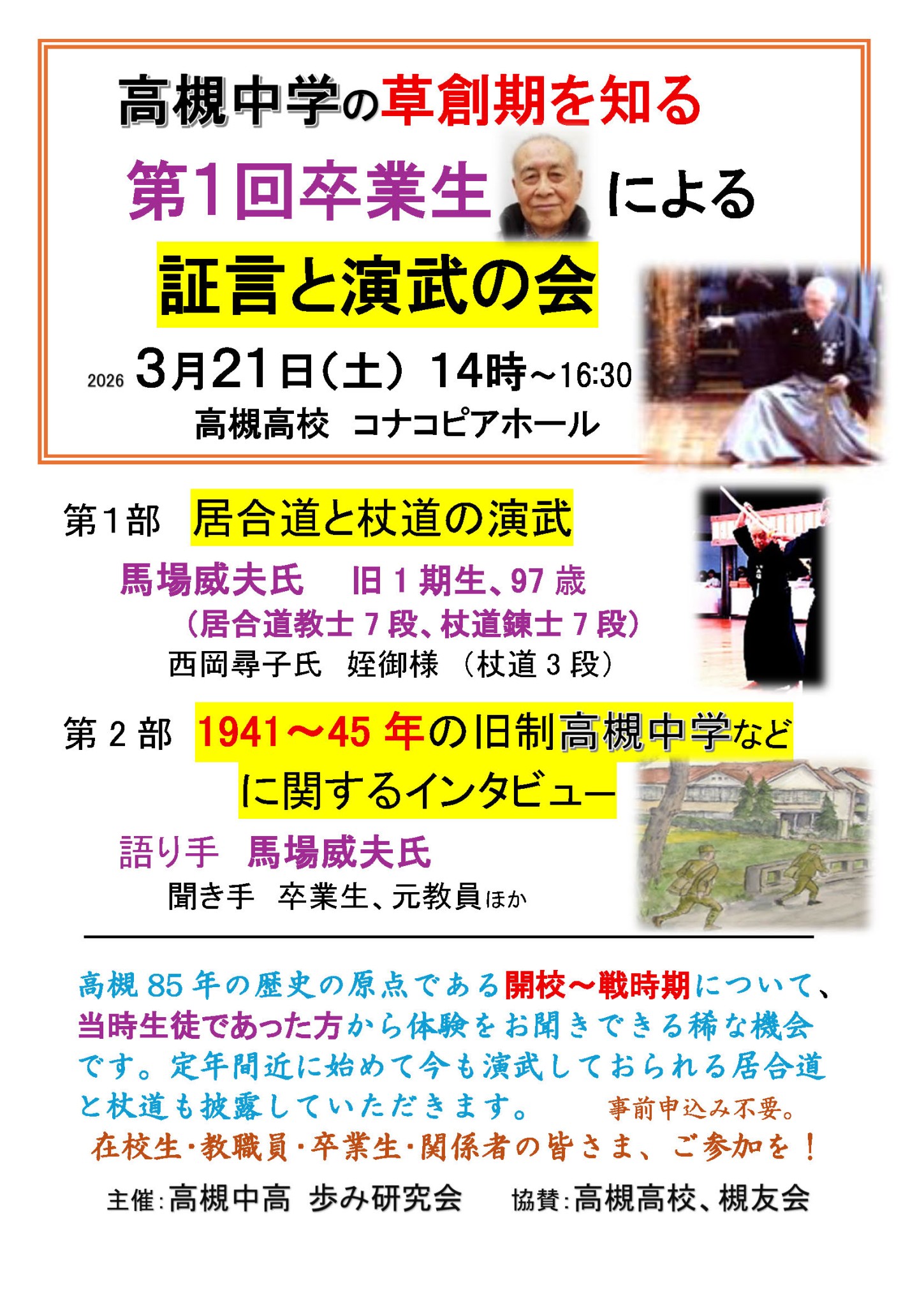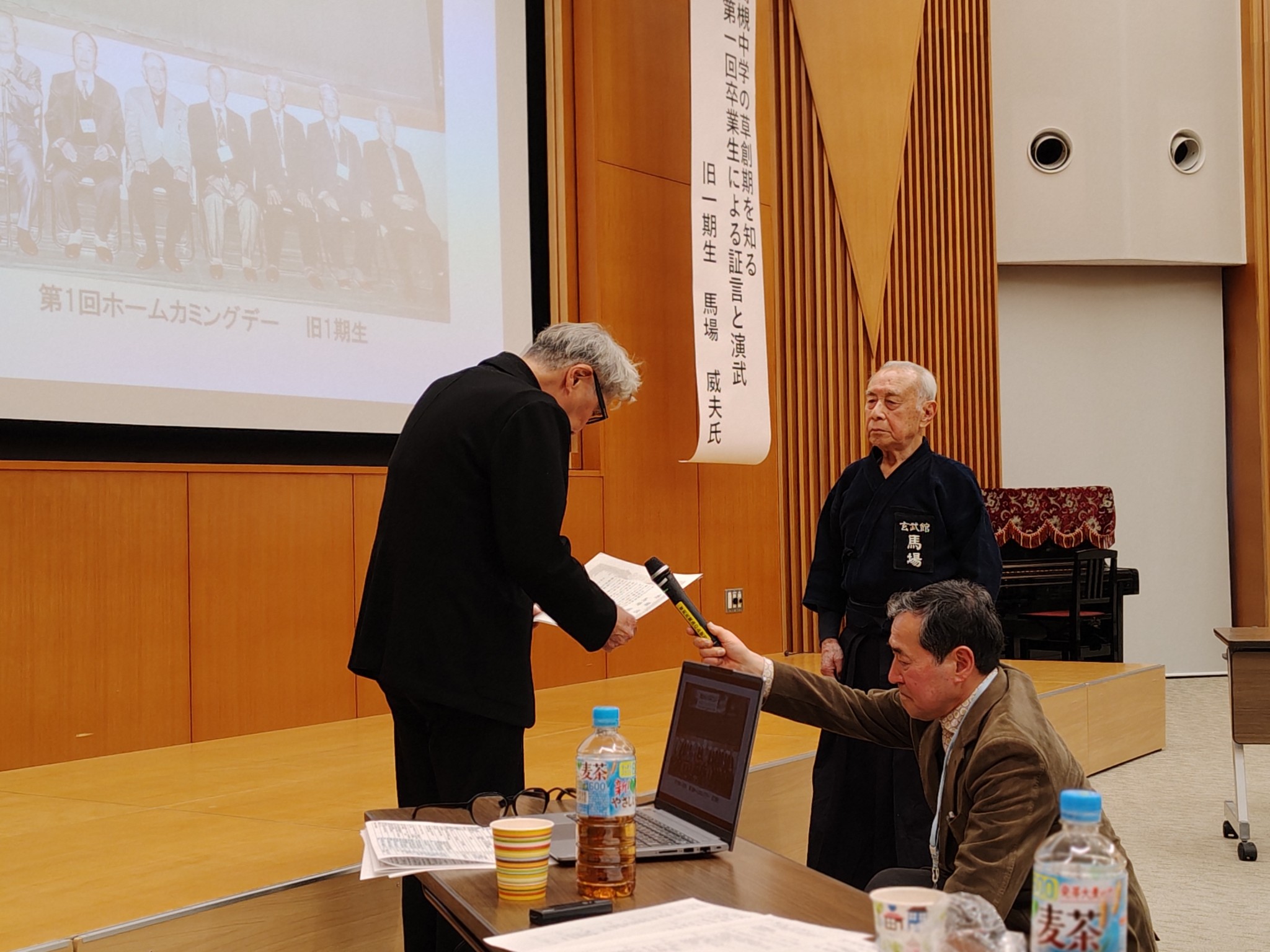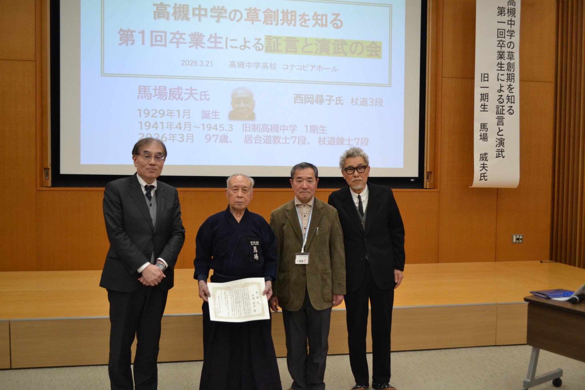 3月21日(土)午後、本校第1期卒業生である馬場威夫様をお招きし、「高槻中学の草創期を知る 第1回卒業生による証言と演武の会」をコナコピアホールにて開催しました。馬場威夫様は1941年に高槻中学校に入学され、現在97歳を迎えられてなおご健勝でいらっしゃいます。